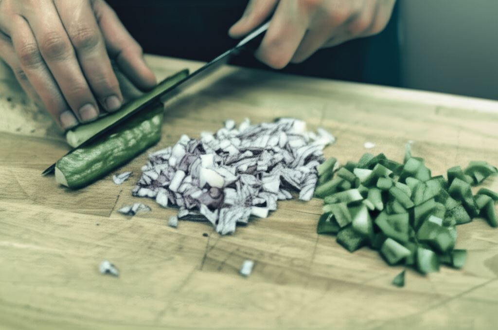 Paprykę oczyść z pestek i wraz z ogórkiem oraz cebulą pokrój w drobną kostkę.