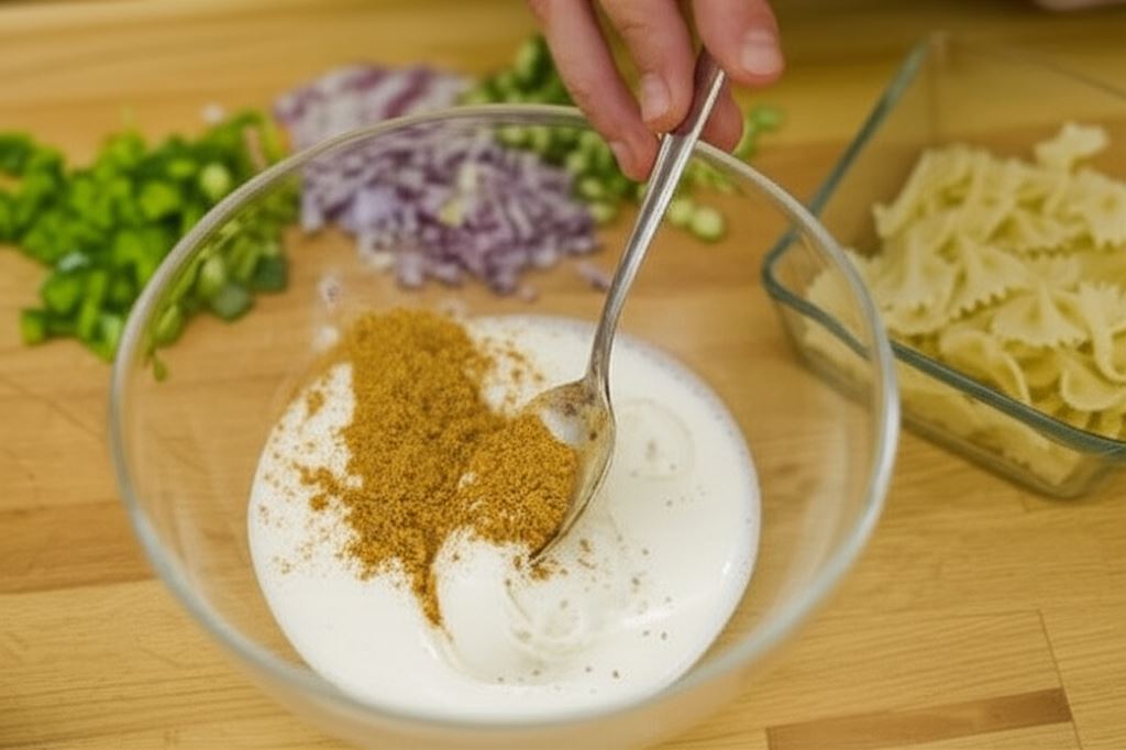 Sporządź sos, mieszając Majonez Babuni Hellmann's, jogurt oraz zawartość opakowania sos sałatkowy Knorr.
