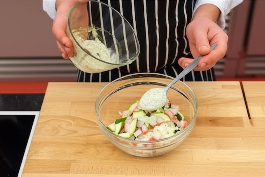 Sos sałatkowy Knorr połącz ze śmietaną, sokiem z cytryny i kilkoma kroplami tabasco. Potem zmieszaj wszystkie składniki sałatki z sosem i przełóż do miseczek. Na wierzchu możesz ozdobić sałatkę np. świeżym koperkiem i plasterkiem cytryny.