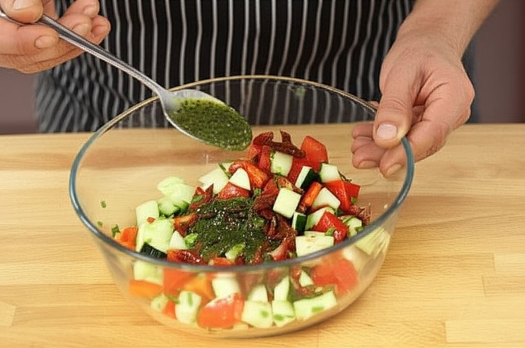 Przygotuj sos do sałatek Knorr Naturalnie Smaczne i wmieszaj go do warzyw. Wszystko dokładnie wymieszaj.