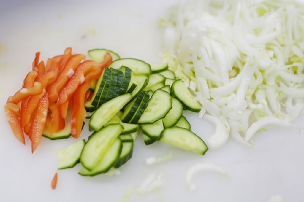 Pekińską kapustę poszatkuj, natomiast paprykę i ogórki pokrój w cienkie paseczki.