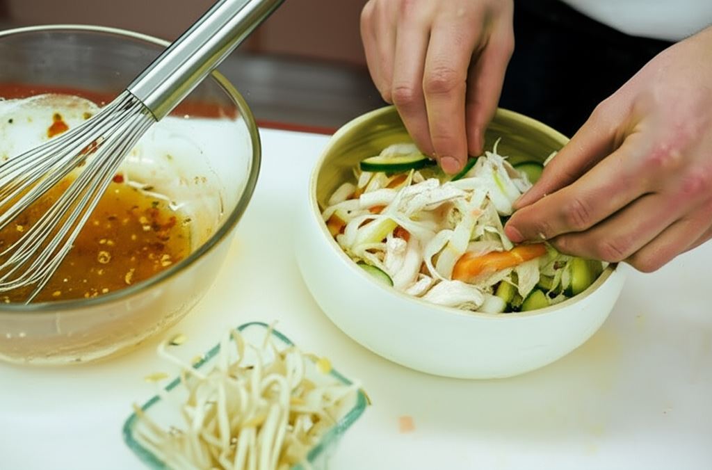 Jeśli lubisz eksperymentować, możesz wzbogacić sałatkę o prażone orzeszki ziemne lub sezam, które dodadzą jej ciekawej tekstury. Dla bardziej wyrazistego smaku wypróbuj dodatek sosu sojowego lub kilka kropel oleju sezamowego. Możesz także zastąpić mięso z kurczaka krewetkami lub tofu, tworząc wegetariańską wersję tej orientalnej przekąski.