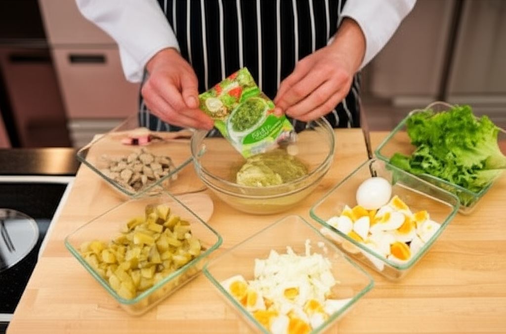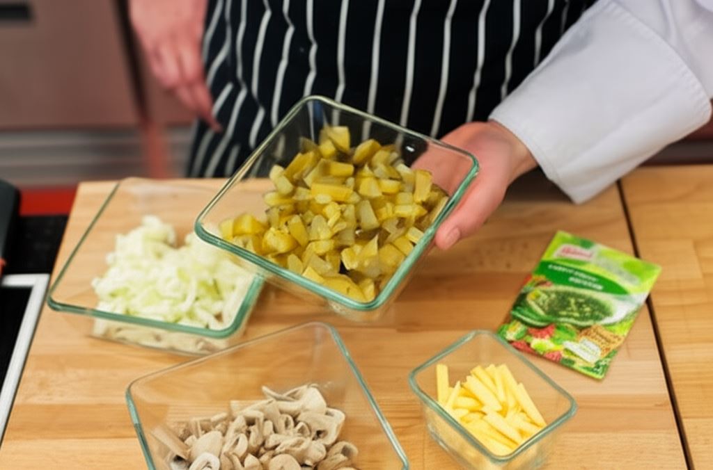 Sekret tej wyjątkowej sałatki tkwi w idealnym połączeniu składników. Ugotowane pieczarki nadają potrawie charakterystycznego, leśnego aromatu, podczas gdy kremowy sos na bazie majonezu Hellmann’s i sosu sałatkowego Knorr otula wszystkie składniki aksamitną konsystencją. Dodatek chrupiącego ogórka kiszonego i delikatnej cebuli wprowadza przyjemny kontrast tekstur.