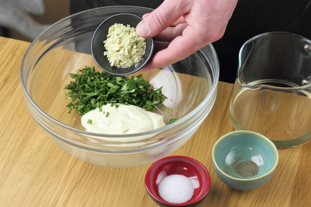 Sporządź sos. W miseczce wymieszaj razem majonez, sok z ogórków, sos czosnkowy Knorr i posiekaną natkę. Wszystko dopraw solą i pieprzem.