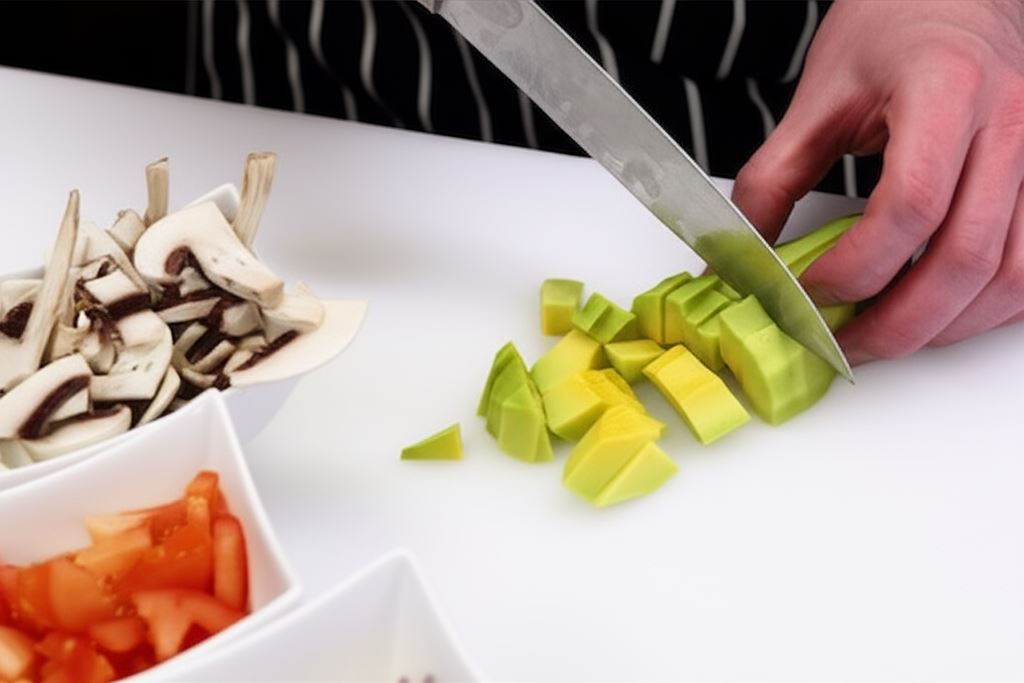 Obierz awokado ze skórki, wyjmij pestkę ze środka, potem pokrój w kostkę i umieść na sałacie. Cebulę i pomidory pokrój w kostkę, pieczarki w półplasterki. Tak jak awokado, umieść je na sałacie.