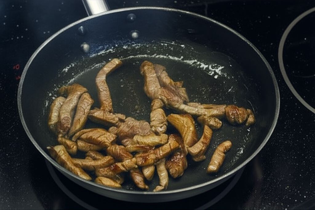 Wlej olej na patelnię. Boczek pokrój w paski, umieść go na patelni i dokładnie usmaż na skwarki. Potem przenieś na sałatę. Wołowinę potnij w paski i obsyp Przyprawą do mięs Knorr. Usmaż na tej samej patelni, na której smażył się boczek. Po usmażeniu również połóż ją na sałacie. Przed serwowaniem posyp sałatkę grzankami.