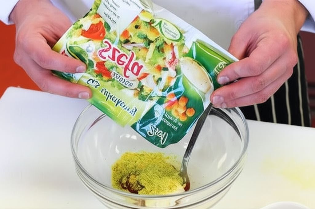 Sporządź sos sałatkowy. Połącz zawartość opakowania Knorr z majonezem i ketchupem. Wsyp pokruszony ser pleśniowy.