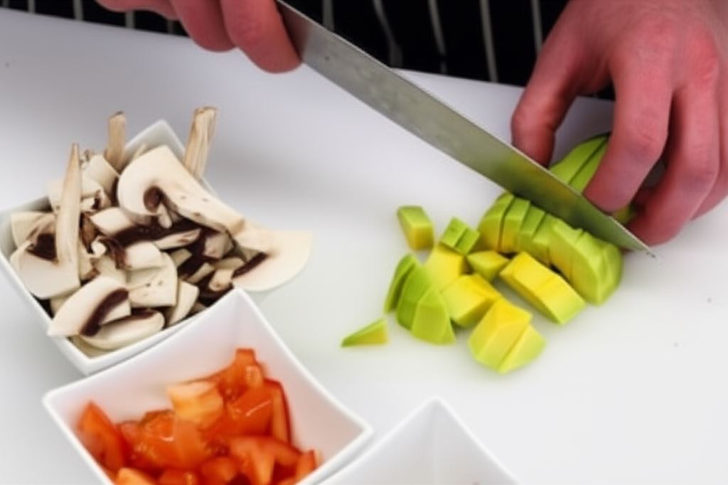 Obierz awokado ze skórki, wyjmij pestkę ze środka, potem pokrój w kostkę i umieść na sałacie. Cebulę i pomidory pokrój w kostkę, pieczarki w półplasterki. Tak jak awokado, umieść je na sałacie.