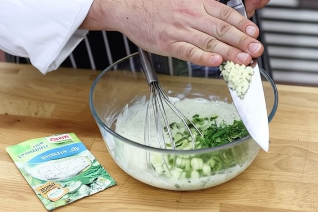 Jogurt połącz z sosem sałatkowym Knorr oraz sokiem z cytryny. Dorzuć do niego ogórki, czosnek, koperek i miętę. Całość starannie wymieszaj.