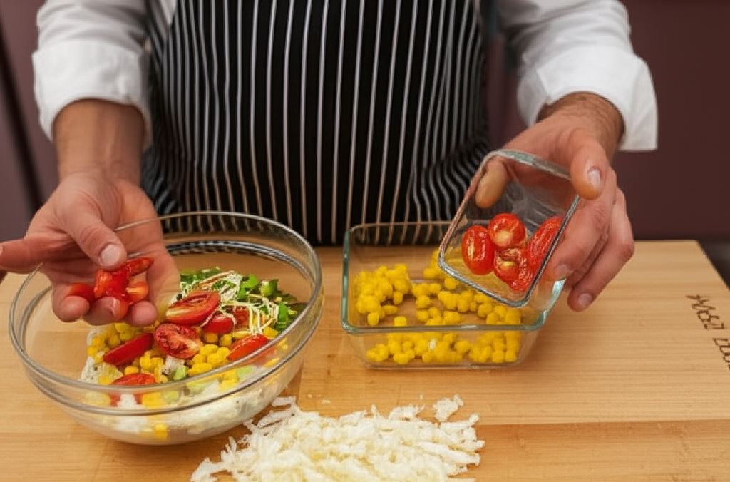 Umieść pokrojone w kostkę cząstki awokado, kukurydzę oraz przekrojone na połówki pomidorki.