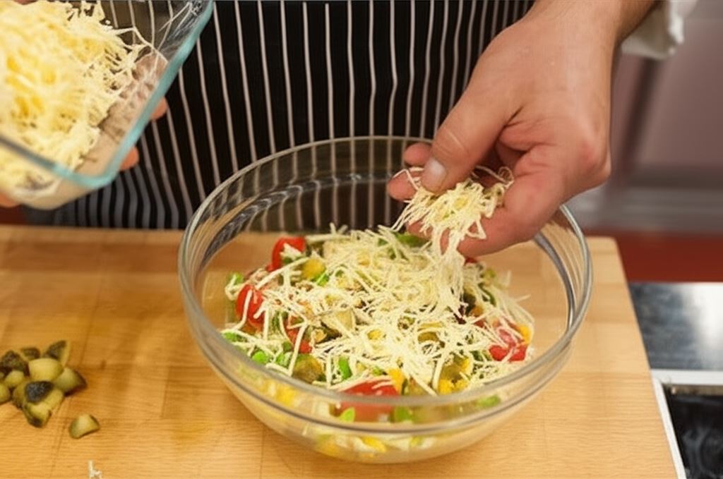 Posyp posiekaną dymką wraz z cebulą, wsyp pokrojonego w kostkę ogórka, dodaj starte białka jajek oraz niewielką ilość startego sera. Operację powtórz minimum dwa razy.