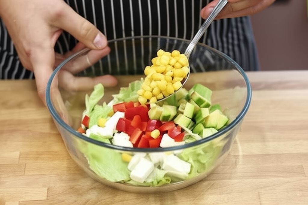 Wymieszaj wszystko i wsyp odcedzoną kukurydzę z puszki. Całość ostrożnie połącz.