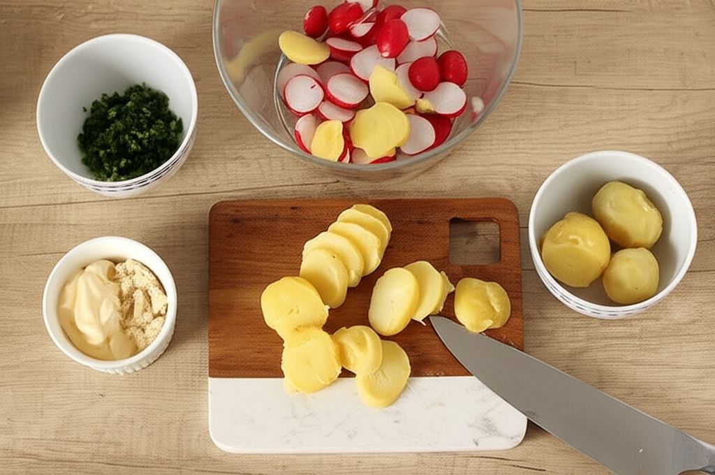 Ziemniaki, rzodkiewkę, kiełbasę oraz korniszony pokrój na grube plastry.