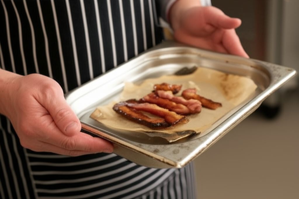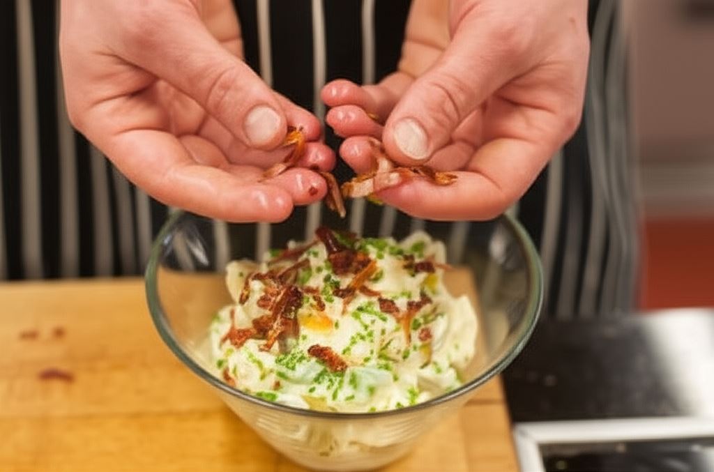 Ziemniaki ugotuj w mundurkach aż będą miękkie, potem ostudź i obierz. Plastry boczku ułóż na blasze wyścielonej pergaminem i zapiecz na chrupko w piekarniku.