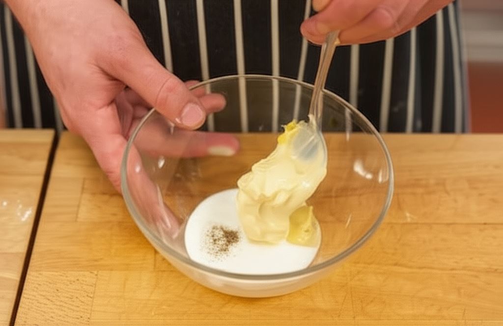 W misce połącz majonez z jogurtem, przypraw musztardą i pieprzem.