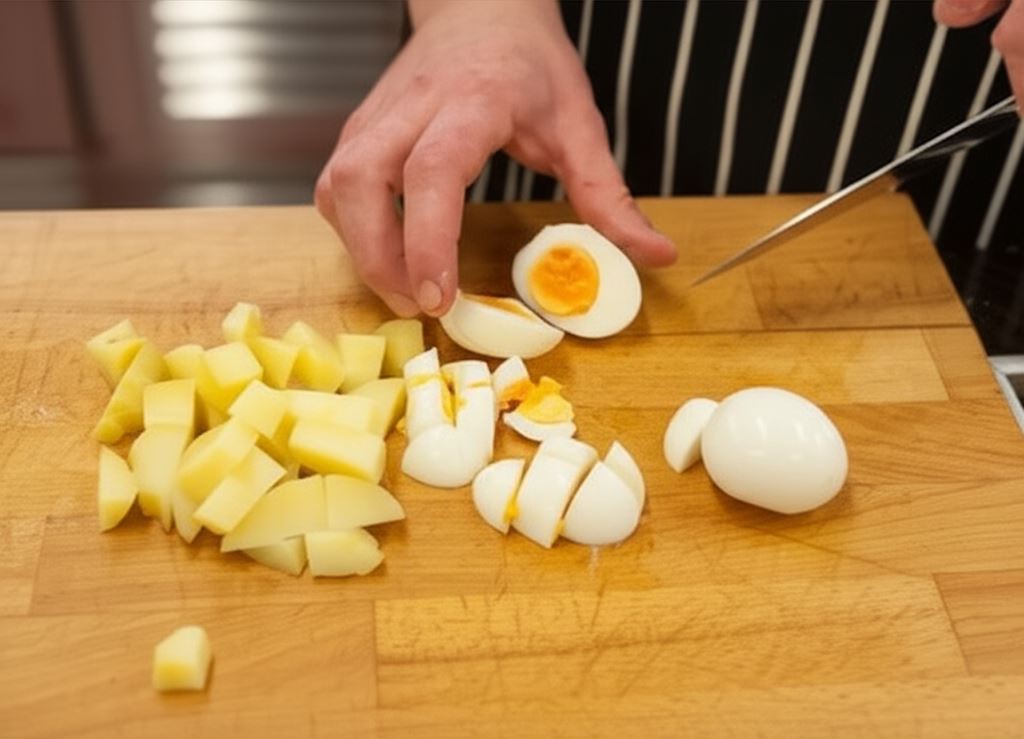 Jajka i ziemniaki pokrój w kostkę o wymiarach 2x2 cm. Dodaj do miski z wcześniej przygotowanym majonezem.