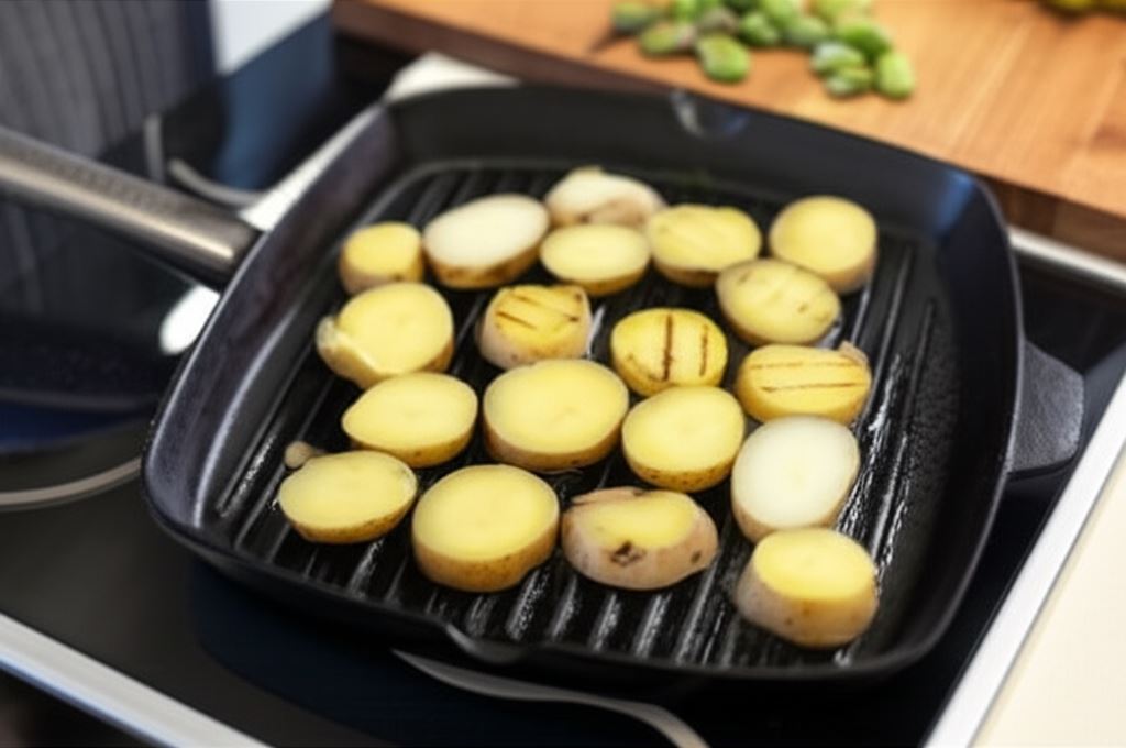 Bób ugotuj i przestudź, a jeśli korzystasz z bobu mrożonego – odmroź go. Ziemniaki ugotuj do półmiękka i ostudź, po czym pokrój w grube plastry i przyrumień na patelni grillowej.