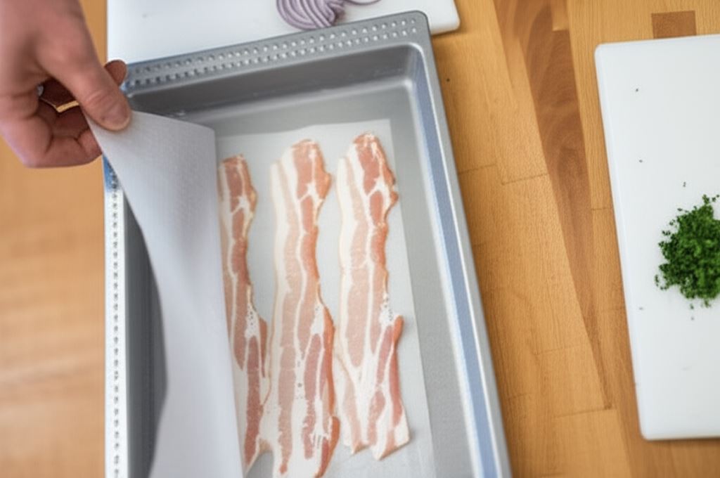 Cebulę pokrój w półkrążki, natkę posiekaj. Boczek umieść pomiędzy dwoma arkuszami papieru do pieczenia, dociśnij drugą blachą i włóż do piekarnika rozgrzanego do 180 °C - piecz przez 15 minut.