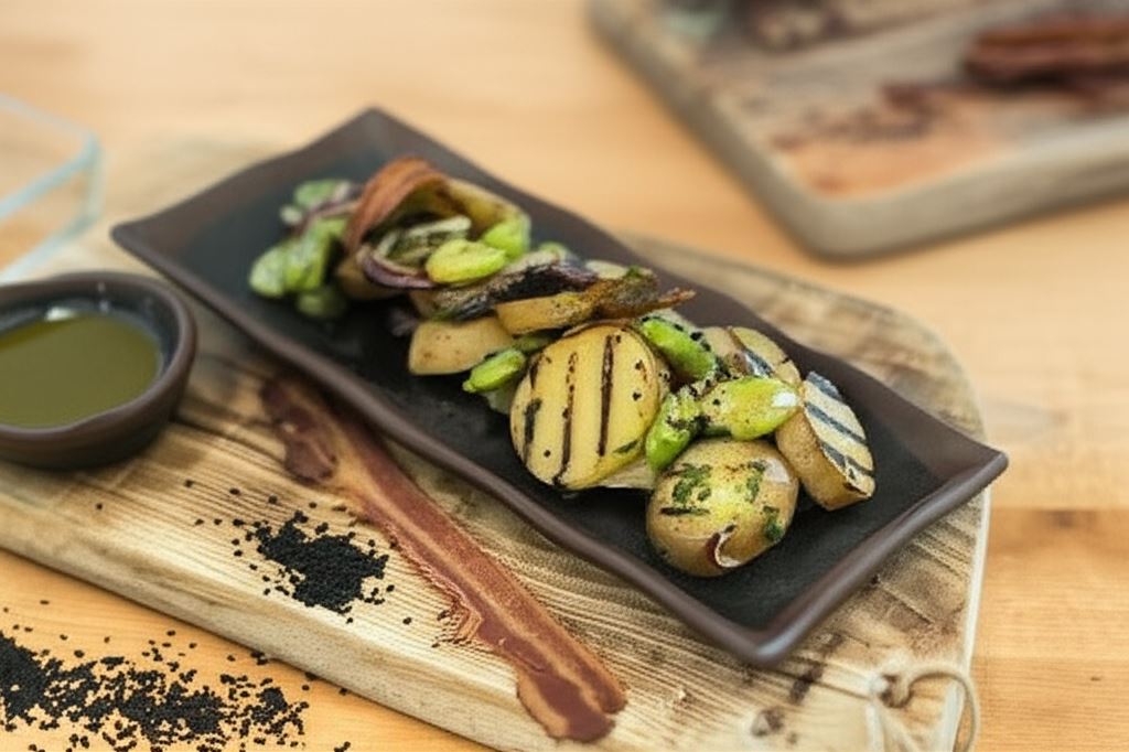 Wyobraź sobie soczysty bób, chrupiące ziemniaki i aromatyczny boczek połączone w jednej misie. Ta sałatka to prawdziwa symfonia smaków, która zachwyci Cię swoją prostotą i wyrazistością. Delikatność bobu idealnie komponuje się z ziemniakami grillowanymi na patelni, a całość dopełnia chrupiący boczek i orzeźwiający sos koperkowo-ziołowy.