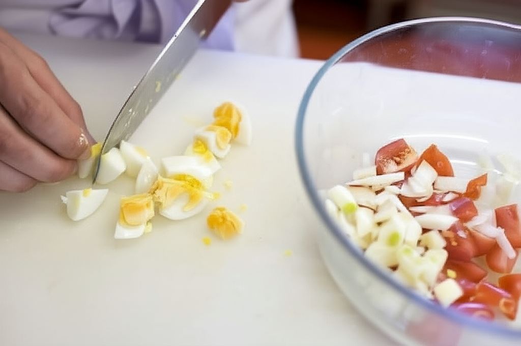 Pokrój w kostkę pomidory, jajka oraz cebulę.