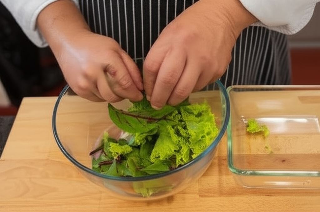 Oddziel liście botwinki od buraczków. Liście razem z sałatą opłucz, wysusz i podrzyj na drobniejsze części.