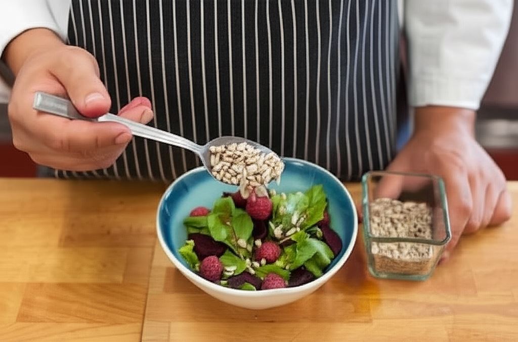 Do sałaty dorzuć buraczki i maliny. Wszystko skrop sosem i ostrożnie wymieszaj. Sałatkę serwuj oprószoną ziarnami słonecznika.