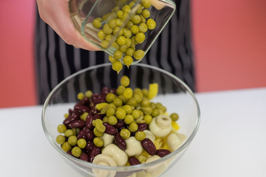 Makaron ugotuj al dente i ostudź. Fasolę, kukurydzę, groszek i pieczarki odcedź z zalewy.