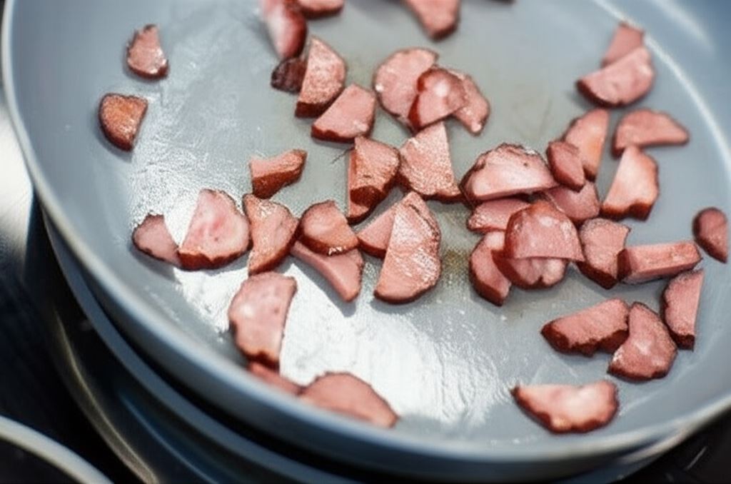 Kiełbasę pokrój na półplastry i przysmaż na patelni.