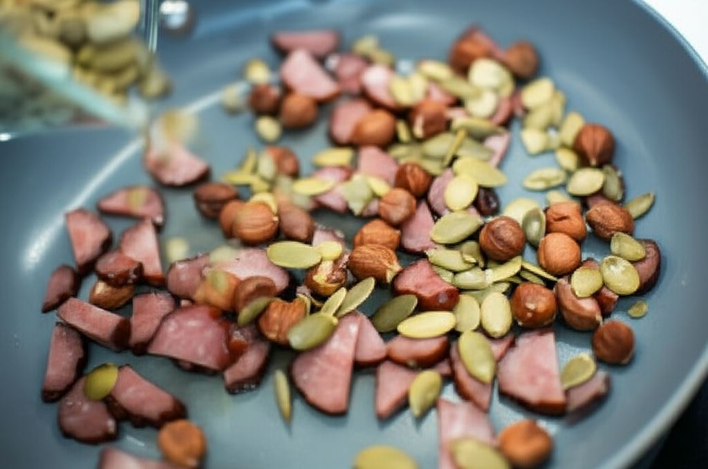 Po chwili smażenia wsyp orzechy laskowe i pestki dyni. Całość smaż jeszcze przez 2 minuty, po czym odstaw do wystygnięcia.