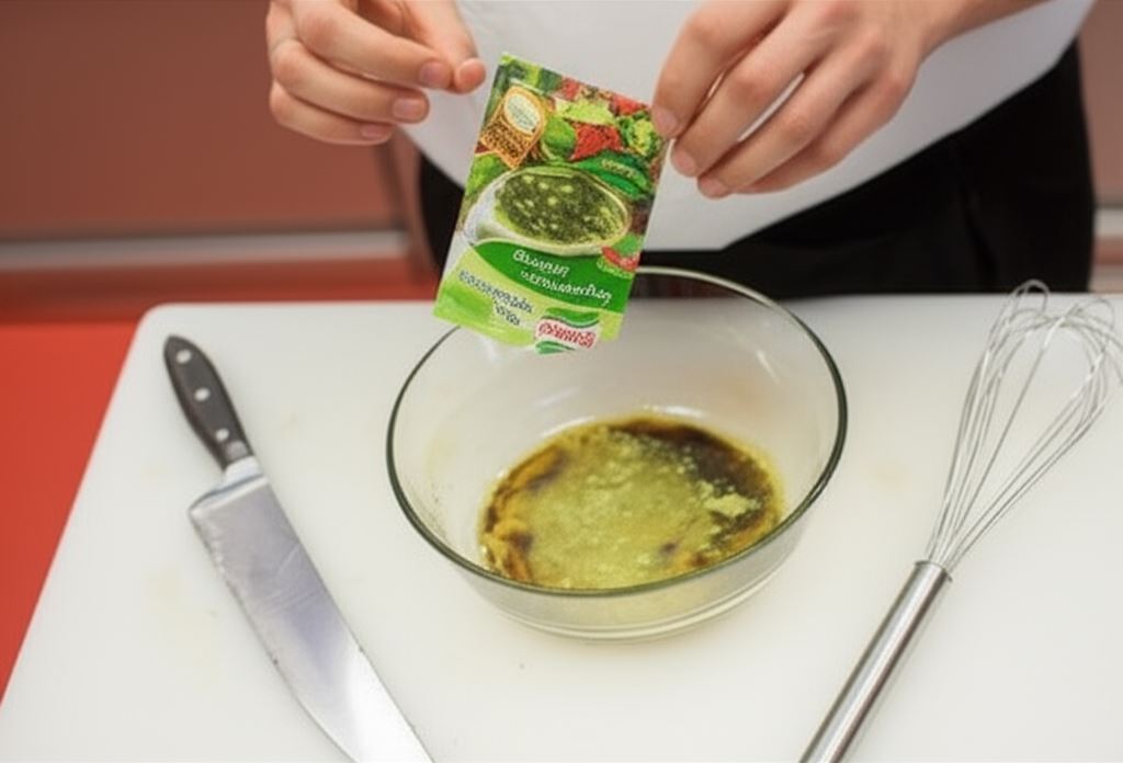 Sos sałatkowy Knorr połącz z trzema łyżkami wody, koniakiem, olejem z pestek winogron oraz olejem z pestek dyni.