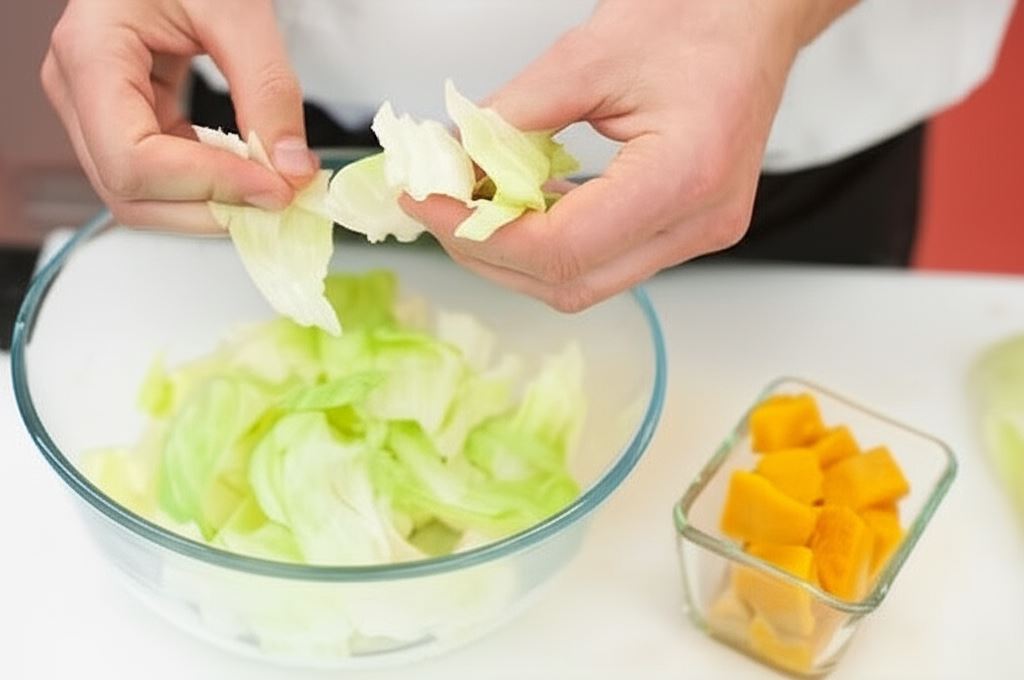 Sałatę lodową podrzyj na drobniejsze części i umieść w misce. Wsyp odcedzone kawałki dyni z słoika.