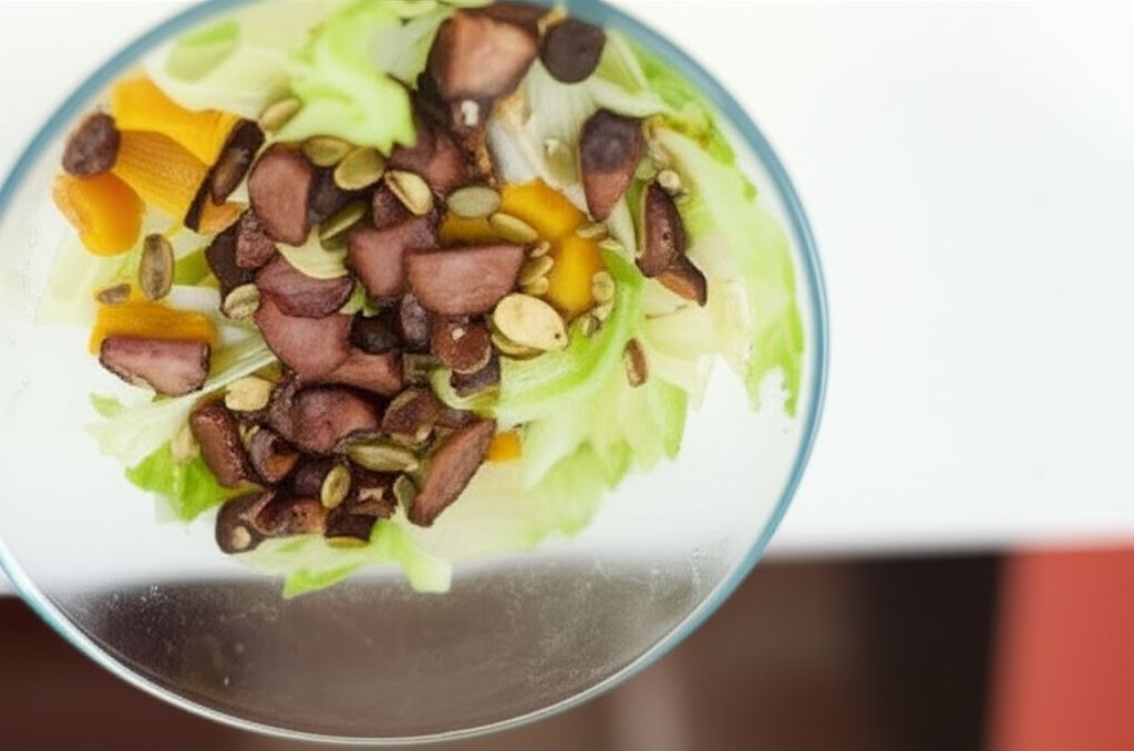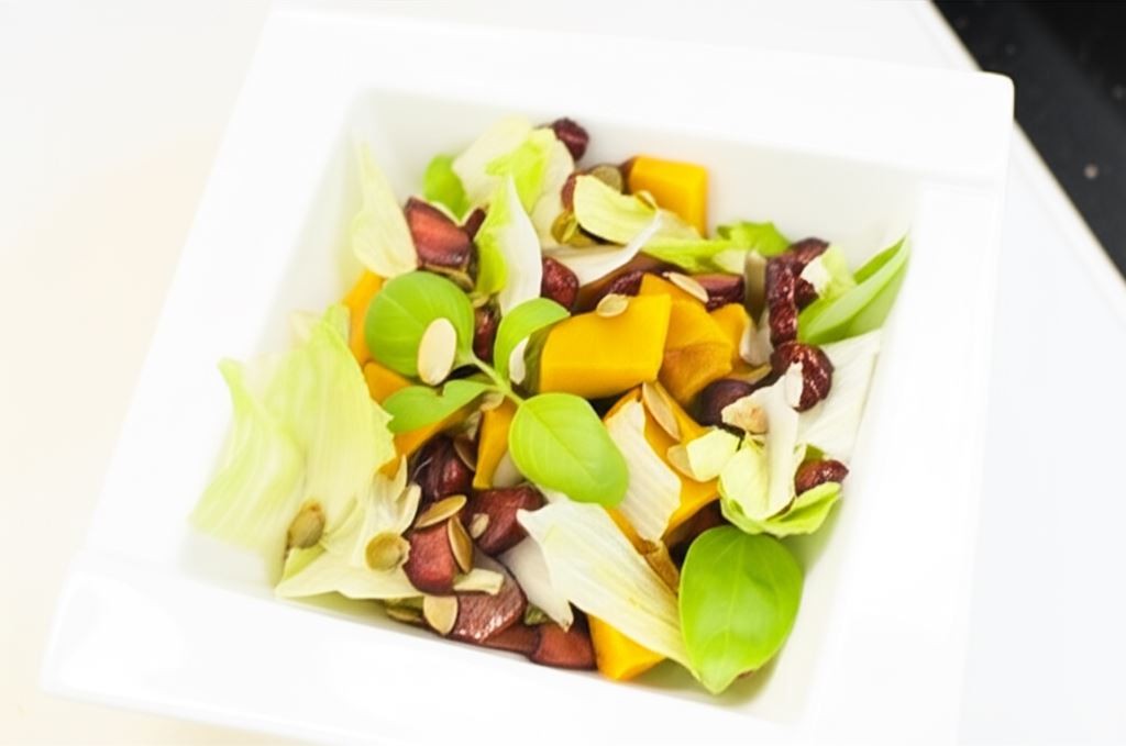 Odkryj wyjątkowe połączenie smaków w tej prostej, a jednocześnie wyrafinowanej sałatce z dynią. Soczyste kawałki dyni doskonale komponują się z podsmażoną kiełbasą, chrupiącymi orzechami laskowymi i pestkami dyni. Całość skropiona jest wykwintnym sosem na bazie koniaku i olejów z pestek, który nadaje potrawie niepowtarzalnego charakteru.