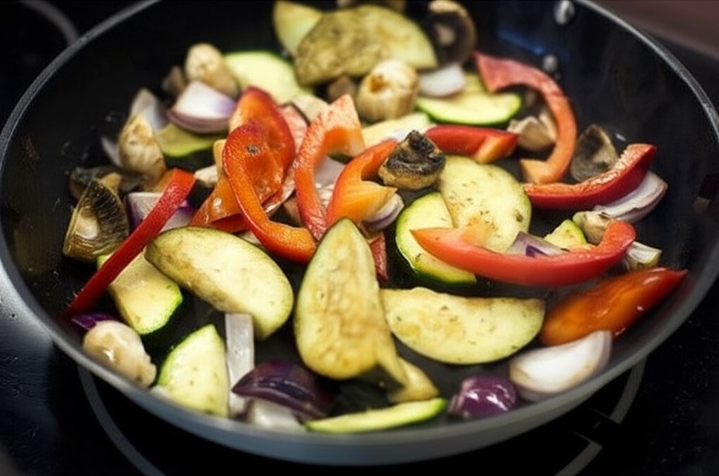 Podgrzej porządnie oliwę w szerokim garnku, potem dodaj warzywa i rozmaryn, smażąc aż nabiorą złotego koloru. Na końcu smażenia dodaj ocet balsamiczny i poczekaj, aż odparuje.
