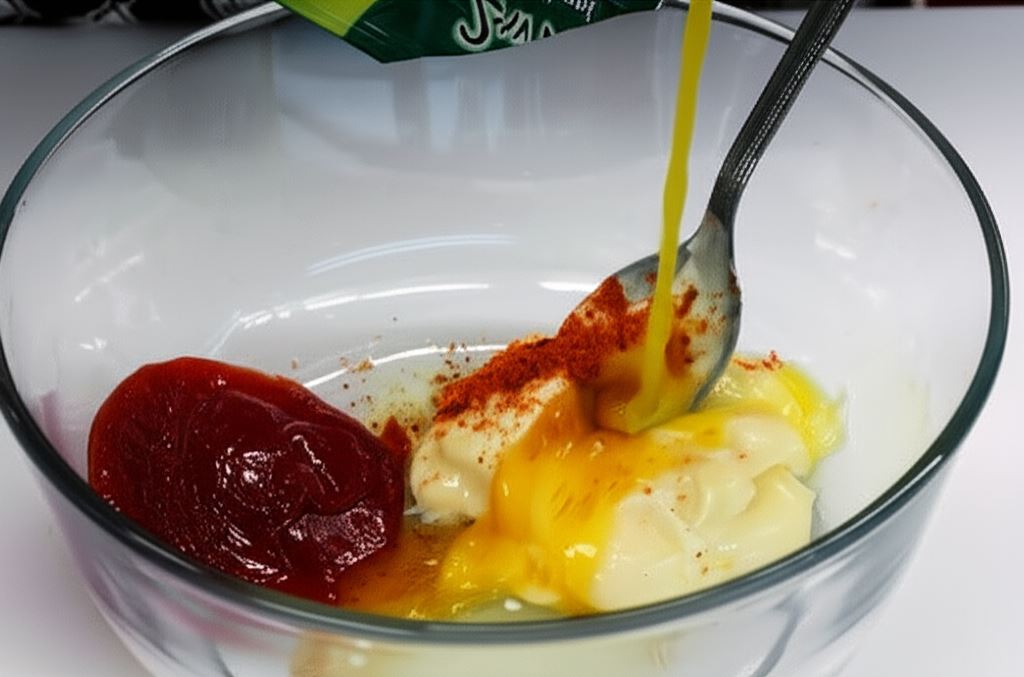 W obszernej misce przygotuj sos, mieszając razem sos Knorr, oliwę, ketchup, majonez oraz sok pomarańczowy.