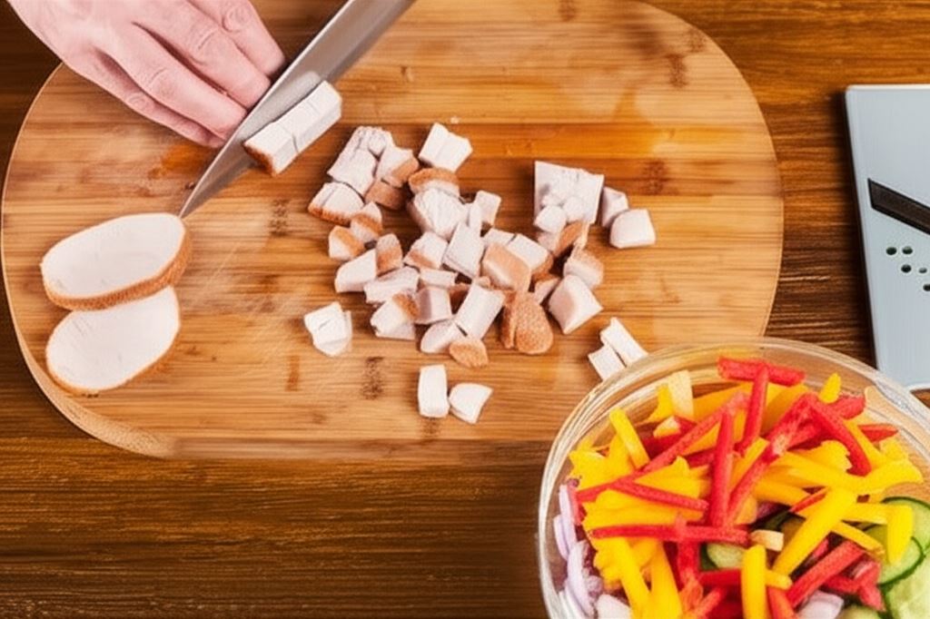 Wyobraź sobie sałatkę, która łączy w sobie wszystko, czego potrzebujesz – delikatne kawałki indyka, al dente ugotowany makaron i chrupiące warzywa. Ta kompozycja to prawdziwa uczta dla podniebienia! Makaron ugotowany na półtwardo i schłodzony stanowi doskonałą bazę, która harmonijnie łączy się z pozostałymi składnikami. Soczyste kawałki indyka, chrupiący ogórek ze skórką, kolorowe papryki pokrojone w paseczki oraz cebula w piórka tworzą razem idealnie zbilansowane danie.