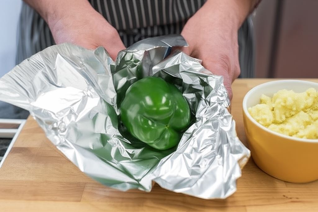 Kaszę przygotuj zgodnie z instrukcją podaną na opakowaniu, po czym ostudź. Paprykę owiń folią aluminiową i zapiecz w piekarniku (10 minut, 180° C). Następnie ostudź i zdejmij skórkę.