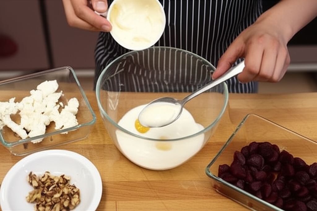 Majonez wymieszaj z jogurtem i musztardą do połączenia. Buraki przekrój na pół, ser podziel na drobniejsze kawałki a orzechy zrumień na suchej, nagrzanej patelni.