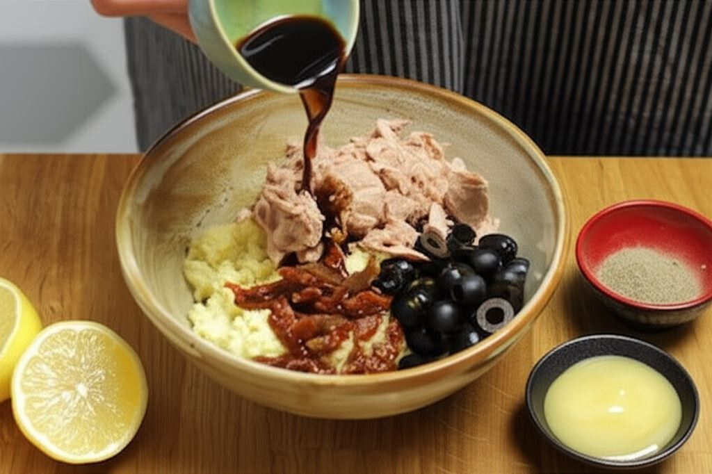 Tuńczyka rozdrobnij, pomidory suszone potnij w paski, oliwki przekrój na połówki.