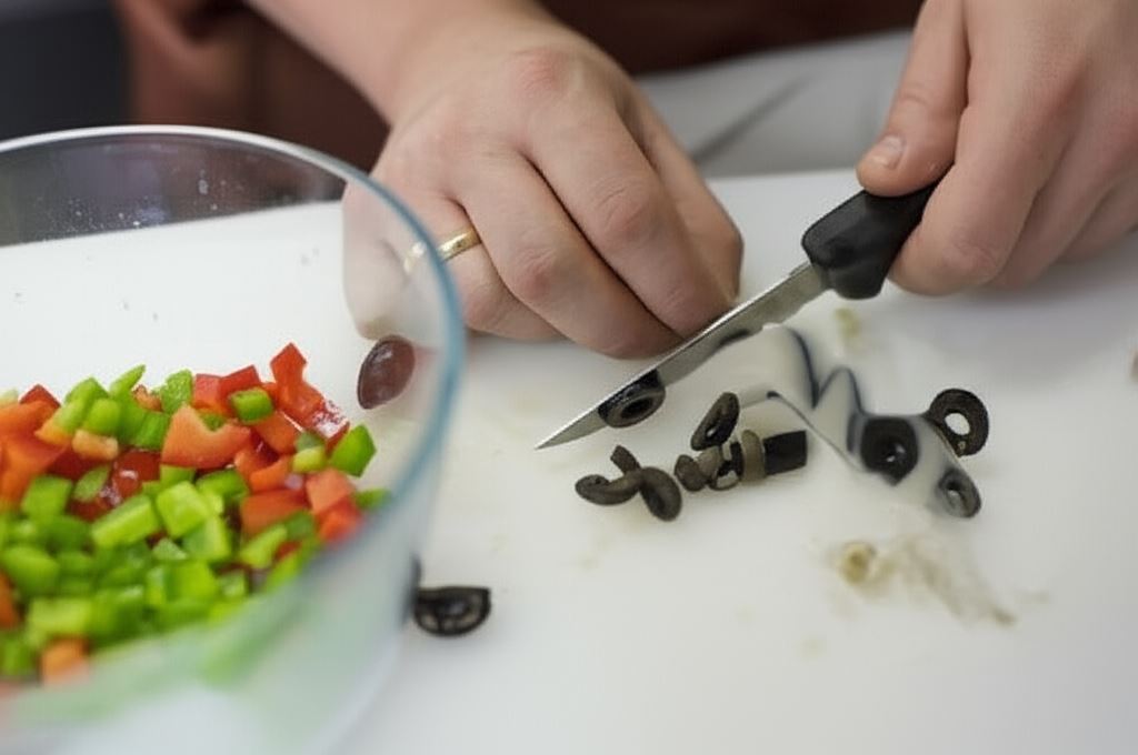 Obie papryki umyj i posiekaj w kostkę. Oliwki zaś pokrój w plasterki.