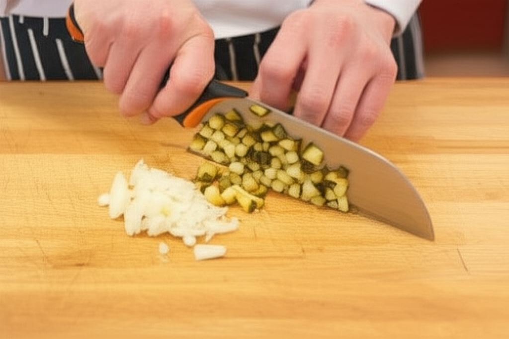 Makaron przygotuj według instrukcji na opakowaniu. Kiełbasę potnij w plastry, a ogórek i cebulkę w małą kostkę.