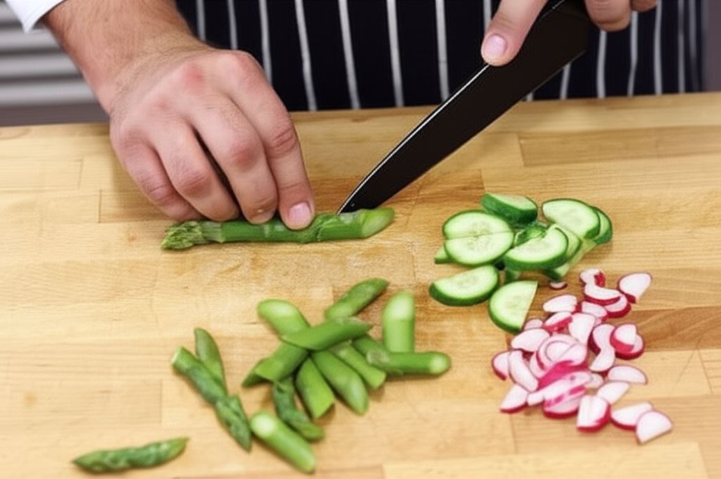 Szparagi potnij na 3 cm kawałki ukośnie. Rzodkiewki i ogórka pokrój w cienkie półplasterki.