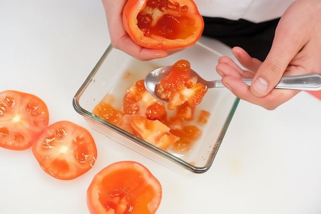 Pomidory opłucz i odetnij z góry krążek, następnie usuń nasiona, a miąższ przełóż do miseczki. Ugotuj ryż.