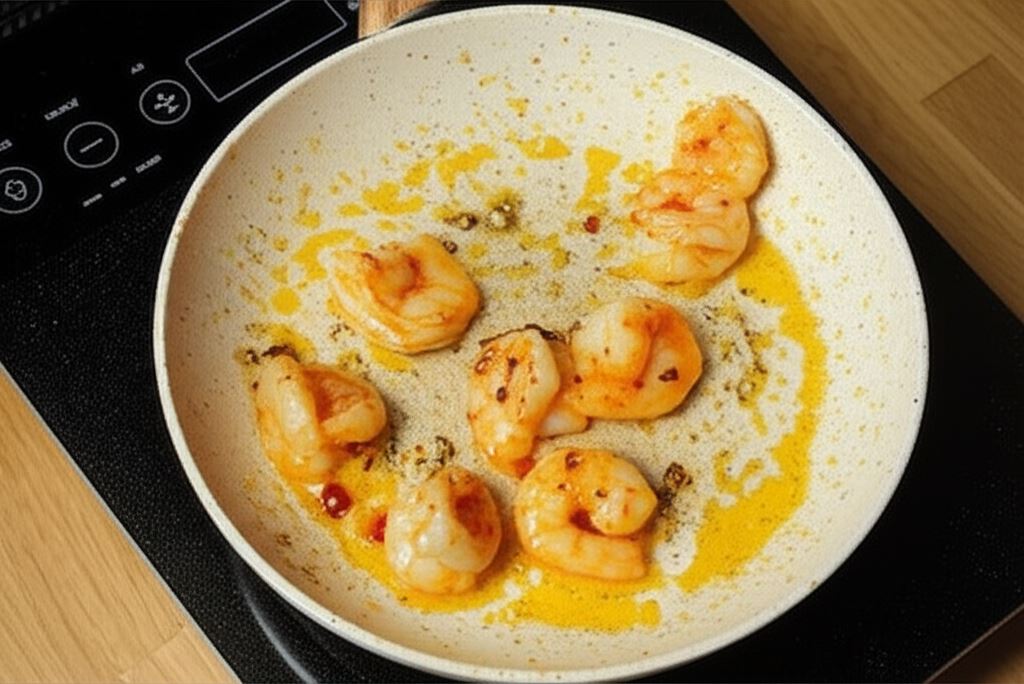 Krewetki smaż na patelni, na gorącej oliwie około 3 min z obu stron. Pod koniec dodaj masło, roztop i odłóż na bok.