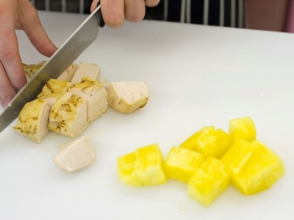 Obierz ananasa ze skórki, potem przekrój go na 4 części i usuń twardy rdzeń. Oczyszczony owoc pokrój w kostkę takiej samej wielkości, jak kurczaka.
