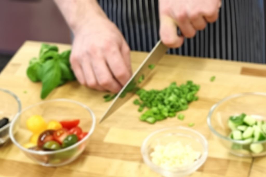 Posiekaj bazylię, czosnek i szczypiorek, pomidorki przetnij na połówki, oliwki pokrój w krążki, a ogórka w drobną kostkę.
