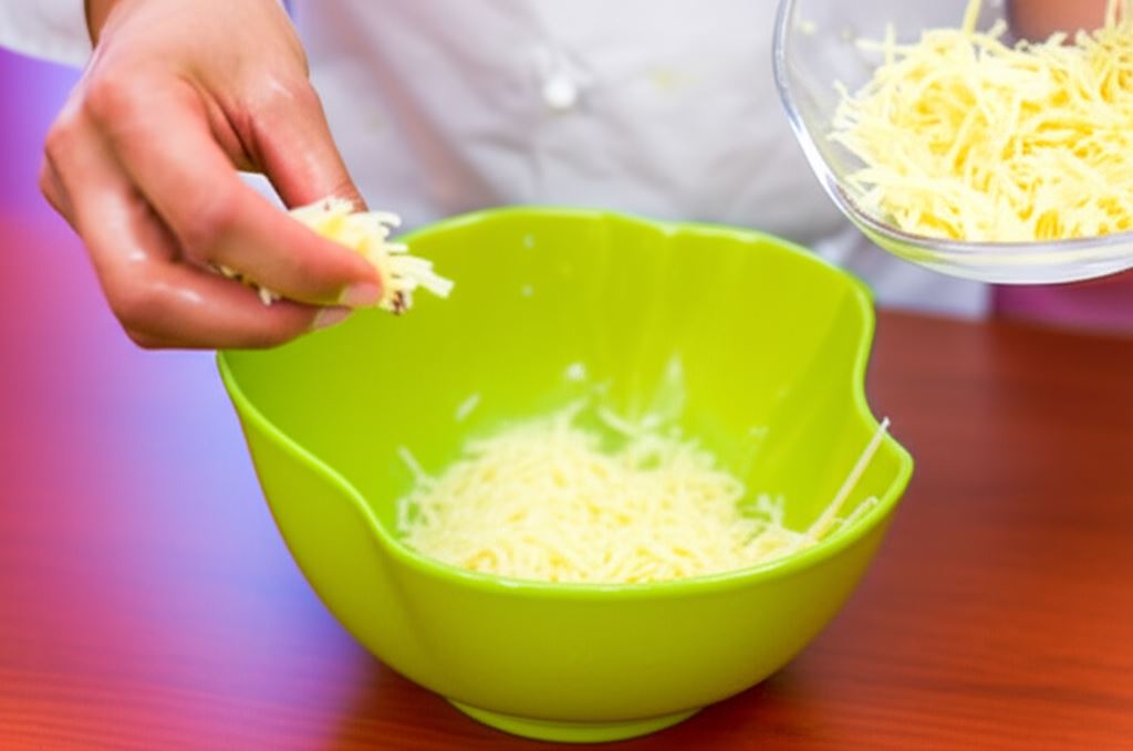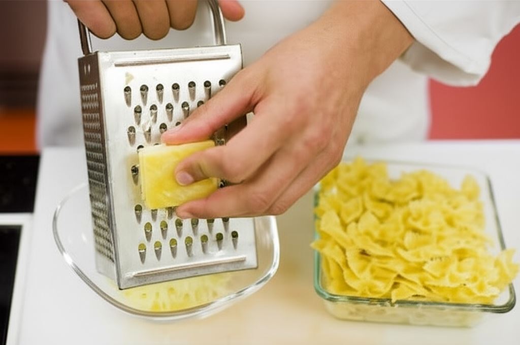 Makaron ugotuj al dente, potem wystudź. Ser zetrzyj na tarce.