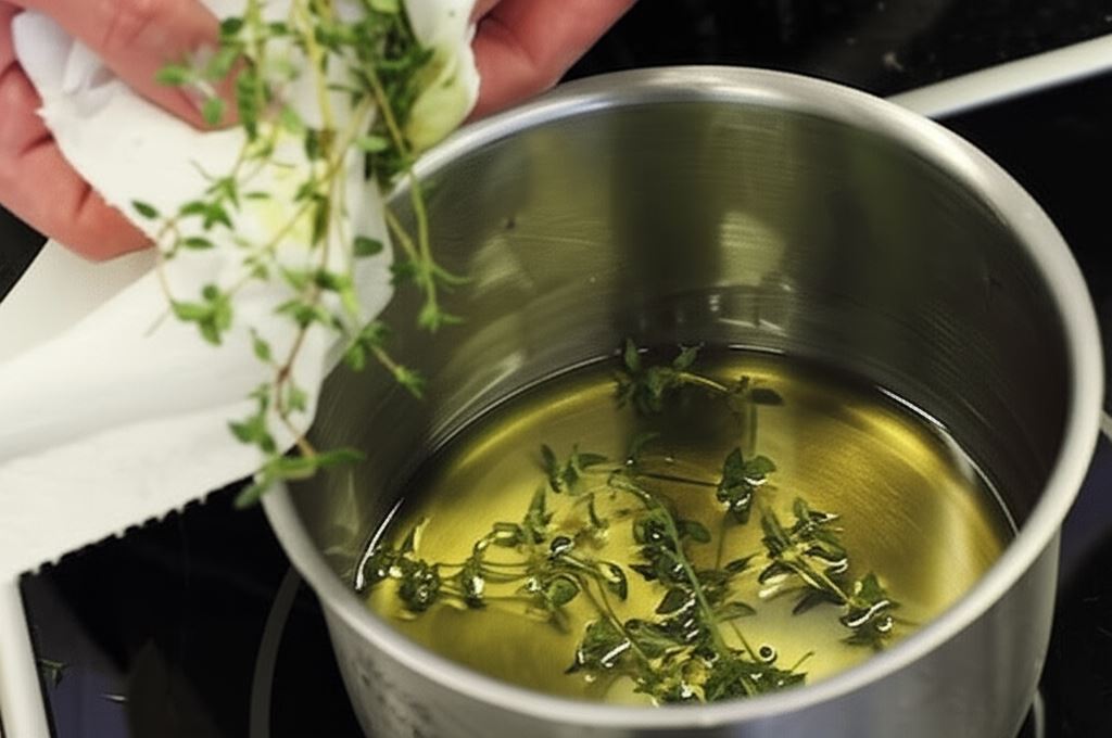 Podgrzej oliwę w garnku, aż stanie się odpowiednio ciepła, ale nie gorąca. Tymianek zawiń w ściereczkę, silnie rozetrzyj i następnie wrzuć do oliwy. Dodaj rozgnieciony ząbek czosnku. Szczelnie przykryj garnek folią i odstaw do momentu, gdy oliwa sama wystygnie. Po ostygnięciu przecedź ją przez sitko.