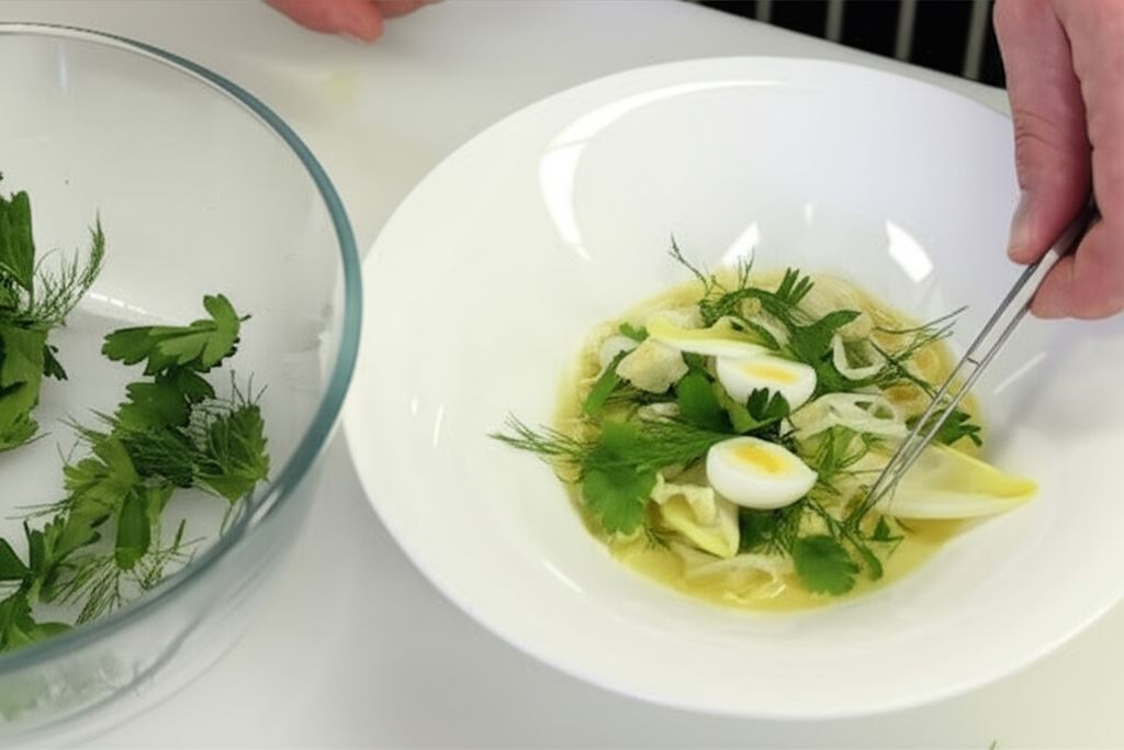 W głęboki talerz wlej aromatyczny bulion z drobiu, umieść fennela, potem listki ziół i połówki jajek. Skrop sałatkę od góry oliwą tymiankową i serwuj z grzanką.