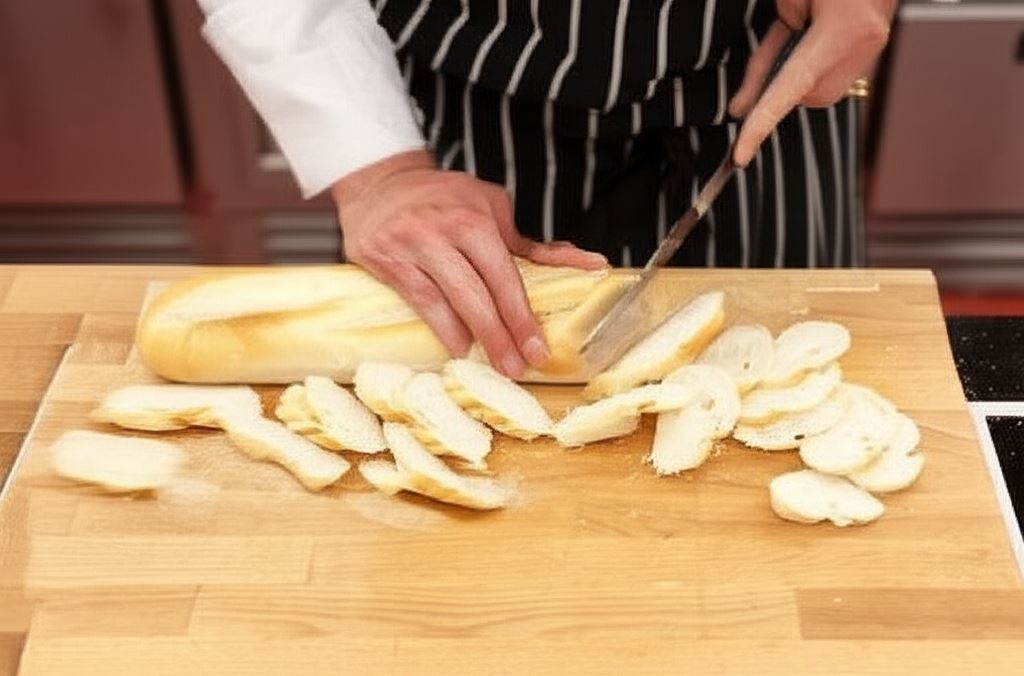 Bułkę bagietkową przekrój na cienkie plastry.