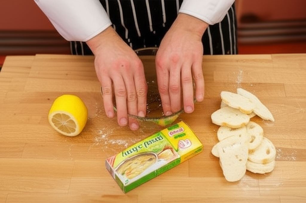 W miseczce wymieszaj kostkę rosołową z oliwą z oliwek i wlej sok z połowy cytryny.